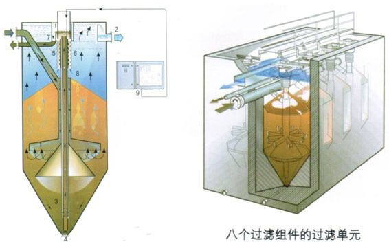 活性砂過濾器采用逆流原理。待處理的水從設(shè)備底部的入流分配管(1)流入,向上流經(jīng)濾床而被過濾,然后向頂部的濾液出流口(2)流出。含有待處理雜質(zhì)的濾砂從設(shè)備錐形底部(3)被空氣提升泵(4)提升到頂部的濾砂清洗器(5)。濾砂的清洗在提升泵中就已經(jīng)開始,在紊流混合作用下雜質(zhì)從砂粒中分離出來,臟砂從泵的出口溢出并進(jìn)入清洗器曲徑通道(6),在那里砂被小流量的清水逆流沖洗干凈,雜質(zhì)通過洗砂水出口(7)排出,而清洗后的砂粒(較重)又返回砂床(8)。結(jié)果是砂床在設(shè)備中不斷的做緩慢下沉運(yùn)動。提升泵用壓縮空氣通過空氣分配器提供(9)水的凈化與砂的清洗同時進(jìn)行,因而過濾器可以不受干擾地連續(xù)進(jìn)行。