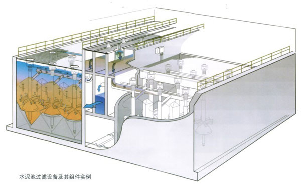 這種類型的過濾器安裝時,所有過濾單元(每個單元由多個過濾組件組成)公用一個砂床。一套設(shè)備實(shí)質(zhì)上沒有過濾面積限制,因此活性砂過濾器可以應(yīng)用在處理相當(dāng)于10萬或更多人口用水的大型水廠和污水處理廠。